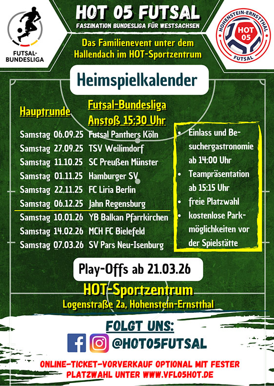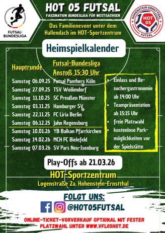 Aufsteiger SC Preußen Münster, als UFC Münster der 1. Deutsche Futsal-Meister im Jahre 2006 , dazu über nahezu 20 Jahre ein Deutscher Futsal-TOP-Club und mit 37 der möglichen 42 Punkte souveräner Champion der Futsal-Regionalliga West in der Vorsaison 2024/2025 , kommt erstmals ins HOT-Sportzentrum.+++ 2014 waren wir als NOFV-Futsal- Meister im Viertelfinale der Deutschen Futsal-Meisterschaft in Münster zu Gast und unterlagen dort 2:3 .+++ Jetzt in der 5.Saison der Futsal-Bundesliga in 2025/2026 gibt es die erste Partie zwischen den Clubs im Deutschen Futsal-Oberhaus in der DFB Futsal-Bundesliga. +++ 14:00 Uhr öffnen wir unsere Spielstätte , freuen uns auf Euren Besuch und sind bereit .+++