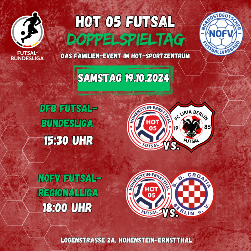 Futsal-Bundesliga mit Ost-Derby HOT 05 gegen FC Liria Berlin am Samstag, 19.10.24 im HOT-Sportzentrum